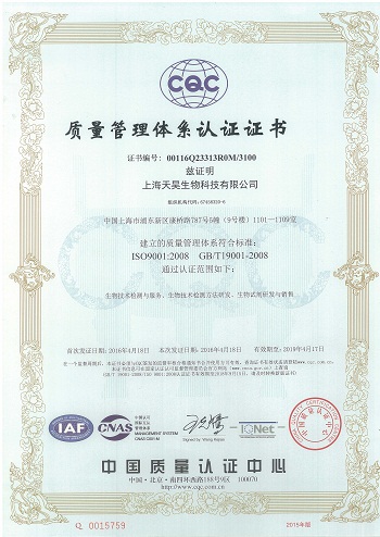 2016.6天昊生物獲得ISO9001:2008質(zhì)量管理體系認證證書