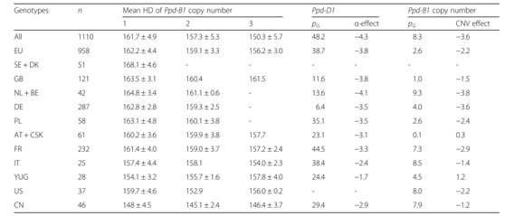Table 1 Ppd-B1不同拷貝數(shù)形式對(duì)田間條件下小麥抽穗時(shí)間(HD)的影響 。