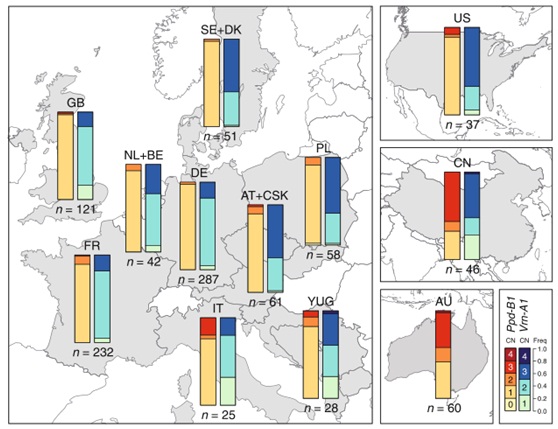 Ppd-B1,Vrn-A1不同拷貝數(shù)形式的系統(tǒng)發(fā)育分析為了評(píng)估Ppd-B1,Vrn-A1的CNV與它們可能的地理起源的關(guān)系,利用簡(jiǎn)化基因組測(cè)序(GBS)得到的全基因組標(biāo)記數(shù)據(jù)來(lái)評(píng)估1110個(gè)小麥品種的遺傳關(guān)系并且把得到的進(jìn)化樹(shù)和所有個(gè)體的Ppd-B1,Vrn-A1的CNV結(jié)合起來(lái)(Fig. 1b)。結(jié)果發(fā)現(xiàn)Ppd-B1的3拷貝數(shù)形式主要集中在中國(guó)小麥品種中;而2拷貝形式存在于相對(duì)親緣關(guān)系較近的群中,但是在系統(tǒng)樹(shù)的其它群中也存在。同樣,Vrn-A1的相同拷貝數(shù)形式主要存在于相對(duì)親緣關(guān)系較近的群中。 評(píng)估Ppd-B1,Vrn-A1不同拷貝數(shù)形式在不同地理區(qū)域的頻率 接著對(duì)這些已知地理起源品種中Ppd-B1,Vrn-A1不同拷貝數(shù)形式的頻率進(jìn)行了評(píng)估,結(jié)果發(fā)現(xiàn)Ppd-B1,Vrn-A1在不同地理區(qū)域有不同的頻率(Fig. 2)。在歐洲Ppd-B1主要是以1拷貝形式存在,只有歐洲北部和中部國(guó)家的極少數(shù)品種攜帶多拷貝數(shù),例如法國(guó)(FR)有些品種有2個(gè)拷貝;意大利(IT)和巴爾干地區(qū)前南斯拉夫(YUG)品種則具有2個(gè)或3個(gè)拷貝。美國(guó)(US)品種的Ppd-B1拷貝數(shù)頻率與南歐地區(qū)類似,主要以1個(gè)拷貝形式存在;而超過(guò)半數(shù)的中國(guó)(CN)和澳大利亞品種(AU)的Ppd-B1拷貝數(shù)大于1,中國(guó)品種主要以3個(gè)拷貝形式存在。 類似的頻率也在發(fā)生在Vrn-A1上(Fig. 2)。在歐洲,多拷貝數(shù)形式的分布反映了小麥起源國(guó)家的氣候條件。北歐國(guó)家瑞典和丹麥以及有更多大陸性氣候國(guó)家(如德國(guó)DE、波蘭PL、奧地利AT、前捷克斯洛伐克CSK)小麥品種的Vrn-A1主要以3拷貝形式存在;荷蘭(NL)、比利時(shí)(BE)、英國(guó)(GB)、法國(guó)(FR)品種的Vrn-A1主要以2拷貝形式存在;1拷貝形式主要存在于南歐品種;中國(guó)(CN)和美國(guó)(US)品種的Vrn-A1主要以3拷貝形式存在,也有一定數(shù)量的中國(guó)品種以1拷貝形式存在。 ![]()