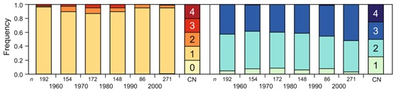 分析Ppd-B1和Vrn-A1不同拷貝數(shù)形式在不同時(shí)間的分布接著分析了不同拷貝數(shù)形式在不同時(shí)期的頻率(以品種的注冊(cè)時(shí)期為參考)。結(jié)果發(fā)現(xiàn)本次研究中的最老品種(1960年)存在所有拷貝數(shù)形式,這些拷貝數(shù)形式隨著時(shí)間變化不大(Fig. 3)。 ![]()
