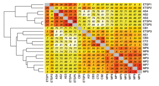 圖2. NirS基因的OTU系統(tǒng)發(fā)育樹。Marsh sediments:沼澤沉積物;Estuarine sediments:河口沉積物;Eastern Tropical S.Pacific ODZ : 熱帶東太平洋; Arabian Sea ODZ:阿拉伯海 3. NirS基因Beta多樣性分析 基于weighted UniFrac的熱圖顯示樣品可以聚類于兩種,一類是ODZs區(qū)域的大部分樣品,一類是所有的沉積物樣品和兩個來自于ODZ區(qū)域的ETSP3和AS1,表明不同棲息地的反硝化細(xì)菌群落之間有著顯著差異,這個結(jié)果也通過Adonis分析結(jié)果證明。