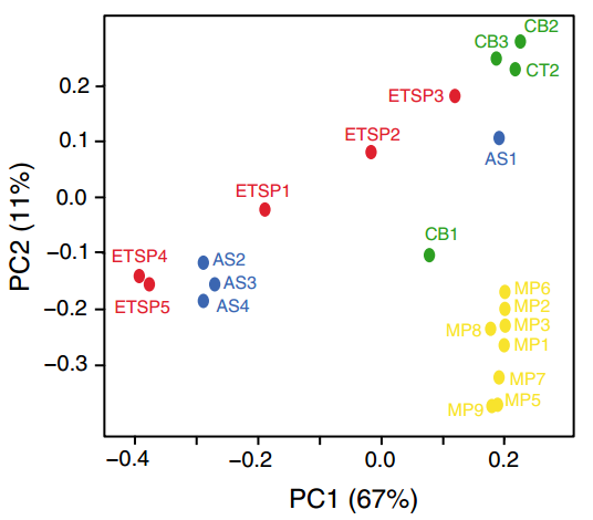 圖3. 對nirS序列的weighted UniFrac熱圖分析。UniFrac 度量越低,就和被比較樣本的群落結(jié)構(gòu)越相似。方框中的數(shù)字代表是UniFrac 度量。ETSP:東部熱帶南太平洋地區(qū);AS:阿拉伯海;CB:切薩皮克灣;MP: Sippewissett沼澤區(qū) 基于weighted UniFrac距離的PCoA分析進(jìn)一步證實(shí)了熱圖的聚類結(jié)果。一軸和二軸分別解釋了67%和11%的群落差異。此外可以看出8個鹽沼地樣品(MP)和ODZs的樣品隨著x軸分布分別聚類,CB樣品沿著y軸分布聚在一簇。ODZs區(qū)樣品形成一個主要類群,包括AS區(qū)3個樣品和ETSP區(qū)3個樣品。