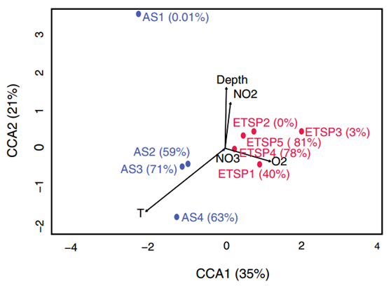 圖4:基于weighted UniFrac距離的PCoA分析。AS:阿拉伯海; ETSP:東部熱帶南太平洋;CB:切薩皮克灣;MP:Sippewissett沼澤區(qū); 為了進(jìn)一步研究ODZs區(qū)反硝化細(xì)菌的群落結(jié)構(gòu),研究者分析了每個采樣點(diǎn)的環(huán)境因子與反硝化細(xì)菌群落結(jié)構(gòu)的關(guān)系。CCA圖顯示AS和ETSP樣品分布不同,一軸和二軸解釋度分別為35%和21%。ETSP樣品聚類更明顯。發(fā)現(xiàn)溫度對AS和ETSP反硝化細(xì)菌群落變異的影響最大。在CCA圖中,每個樣品后面的百分?jǐn)?shù)顯示了每個樣品中這條序列占所有序列的百分比。發(fā)現(xiàn)ETSP5樣品中這條序列百分?jǐn)?shù)更高。還發(fā)現(xiàn)亞硝酸鹽濃度和深度也與群落變異相關(guān),揭示了在任何給定時間內(nèi)厭氧氨氧化或者反硝化中氮損耗過程是動態(tài)的。
