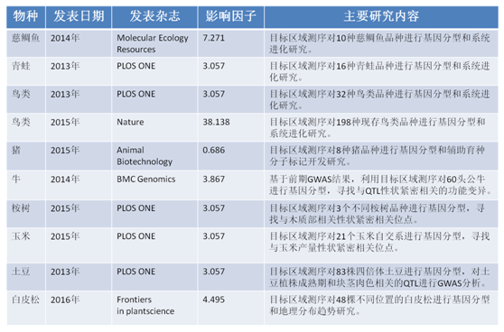 PART3 應用領域 目標區(qū)域測序選擇的目標基因或目標區(qū)域自由度很高,這也就無形中決定了其應用領域的豐富多彩??纯瓷媳碇懈鱾€文章的主要研究內(nèi)容和下表歸納總結(jié)的流程圖就知道目標區(qū)域測序在動植物研究領域應用多廣泛了。