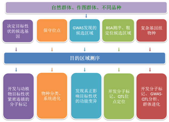 目標區(qū)域測序(Targeted Sequencing)顧名思義是指針對感興趣的目標區(qū)域富集后進行大規(guī)模測序。研究者可以針對自己感興趣的染色體區(qū)域或者大量的候選基因區(qū)域進行數(shù)百個甚至上千個樣品的序列測定。 目標區(qū)域測序作為外顯子測序的一種變異形式因為其目標選擇靈活,測序深度高,費用低等特點目前在醫(yī)學研究中與其它技術(shù)搭配得到了廣泛應用,例如外顯子組測序+目標區(qū)域測序驗證、目標區(qū)域測序+基因分型驗證。然而經(jīng)過我們細心的文獻搜集,我們發(fā)現(xiàn)目標區(qū)域測序在動植物研究領域也有很多重要的應用,它不僅可以作為其它技術(shù)研究結(jié)果的后續(xù)縱深擴展,而且可以單獨作為整篇文章的技術(shù)支撐,下面我們就欣賞一下目標區(qū)域測序在動植物研究領域的那風華絕代的身姿。