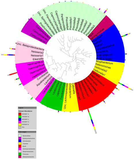 圖1: (CF)病人核心肺部菌群的細(xì)菌多樣性系統(tǒng)發(fā)育樹。內(nèi)環(huán)不同顏色代表來(lái)自5個(gè)不同的門;每個(gè)節(jié)點(diǎn)代表一個(gè)核心OTUs(在50%的樣品都存在的菌群,并且相對(duì)豐度大于總細(xì)菌群落的0.1%);外面的柱狀代表5個(gè)CF病人每個(gè)OTUs的相對(duì)豐度。 銅綠假單胞菌定植早期的CF患者呼吸道菌群動(dòng)態(tài)變化 如圖2A所描繪的 ,在銅綠假單胞菌定植早期CF患者呼吸道菌群在生物量上雖然有波動(dòng),但是每個(gè)個(gè)體的菌群結(jié)構(gòu)還是相對(duì)穩(wěn)定的,可以明顯分為五組。