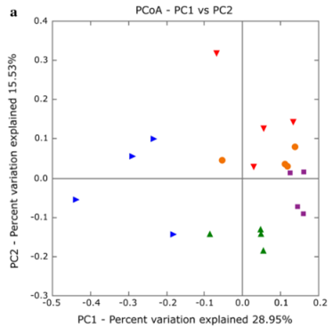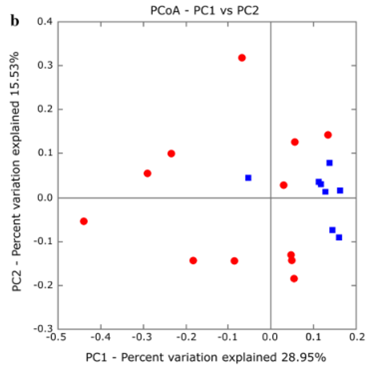 圖2B:“never”組(紅色圓圈)和“free”組(藍(lán)色方塊)CF病人菌群結(jié)構(gòu)PCoA分析。