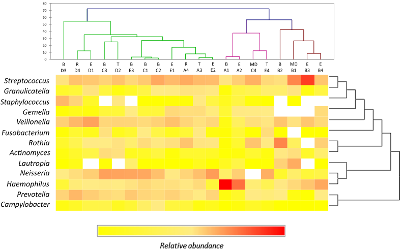 圖3:CF患者痰樣本13主要菌屬的聚類分析。每個(gè)臨床狀態(tài)被注明 (B:基線臨床狀態(tài); E:肺加重; T:治療發(fā)作期; R:恢復(fù)期; MD:數(shù)據(jù)缺失;每一個(gè)菌屬的相對(duì)豐度用紅色(高豐度)或者黃色、亮白色(低豐度)標(biāo)注。 微生物結(jié)構(gòu)與銅綠假單胞菌感染狀態(tài)相關(guān) 接著通過(guò)比較“never”組(在痰或咳嗽拭子中從沒(méi)有檢測(cè)到銅綠假單胞菌定植)和“free”組(至少在前一年沒(méi)有銅綠假單胞菌定植) CF病人菌群來(lái)判斷銅綠假單胞菌是否影響呼吸道菌群結(jié)構(gòu)。首先發(fā)現(xiàn)兩組病人間細(xì)菌密度和銅綠假單胞菌reads數(shù)目沒(méi)有差異,接著發(fā)現(xiàn)這兩組CF病人間的菌群多樣性指數(shù)(Shannon)和菌群均勻度也沒(méi)有差異,然而菌群豐度在兩組CF病人間存在差異:“never”組病人的菌群豐度[Chao-1: 79.8 (72.03–87.61); 實(shí)際觀察到的菌種數(shù)目: 71.6 (63.85–79.43)]要比“free”組病人[Chao-1: 62.7 (52–73.5); 實(shí)際觀察到菌種數(shù)目:55.9 (45.24–66.71)]的菌群豐度更高,因此CF病人呼吸道菌群豐度直接受銅綠假單胞菌首次植入的負(fù)調(diào)控。另外,如圖2B和圖S3所示,CF病人呼吸道菌群結(jié)構(gòu)受銅綠假單胞菌不同感染狀態(tài)的影響。