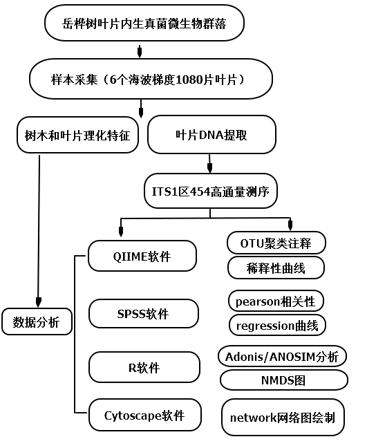 植物體內(nèi)普遍存在著內(nèi)生菌,主要包括內(nèi)生細(xì)菌、內(nèi)生真菌和內(nèi)生放線菌三大類。樹木和灌木葉片內(nèi)的內(nèi)生真菌代表了一類廣泛存在并且高多樣性的真菌類群。目前高通量擴(kuò)增子測(cè)序?yàn)檠芯筷懙刂参锝M織真菌多樣性提供了便利條件。成百上千個(gè)葉片真菌物種僅僅在一個(gè)植物中被發(fā)現(xiàn),成千上萬個(gè)葉片真菌物種在其生長(zhǎng)本土范圍內(nèi)的單一植物種上被發(fā)現(xiàn)。然而,但是關(guān)于它們沿著環(huán)境梯度的多樣性模式仍然是不清楚的,另外關(guān)于這些復(fù)雜的內(nèi)生真菌群落在相同的宿主種中怎么進(jìn)行組合的了解也少之又少。