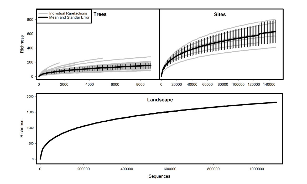 研究者總共采集了54個(gè)岳樺樹樣本(1080片葉片),對(duì)ITS1區(qū)測(cè)序分析共生真菌細(xì)菌群落,共得到1079386條序列,每個(gè)樣本序列范圍在795-81697條之間,形成了1762個(gè)OTU。研究者未去除Singletons(487條,27.64%),因?yàn)樗鼈兛赡艽砹艘恍┫∮械奈⑸镱惾骸4送?,通過去除掉singletons得到的一些的主要結(jié)果也并沒有影響觀察到的趨勢(shì)。