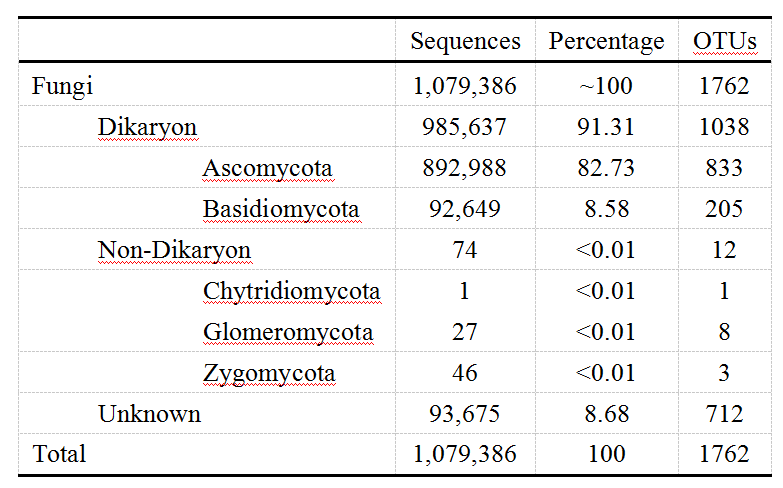 與一些已有的葉片內(nèi)生真菌的研究結(jié)果相一致,所觀測(cè)到的OTU豐富度的稀釋性曲線未能接近于漸近線(Fig S1)。這可能表明了由于采樣或者序列深度問題一些稀有的內(nèi)生真菌物種沒有被觀測(cè)出。盡管如此,岳樺樹或者采樣地點(diǎn)的豐富度是可以比較的。