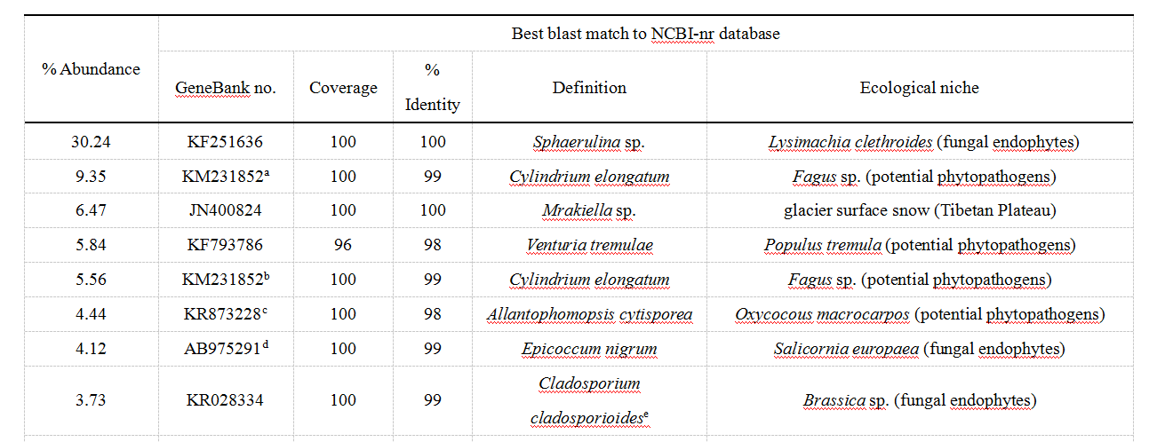 Table S2基于比對(duì)NCBI得到中國長(zhǎng)白山岳樺樹的15個(gè)最高豐度OTUs