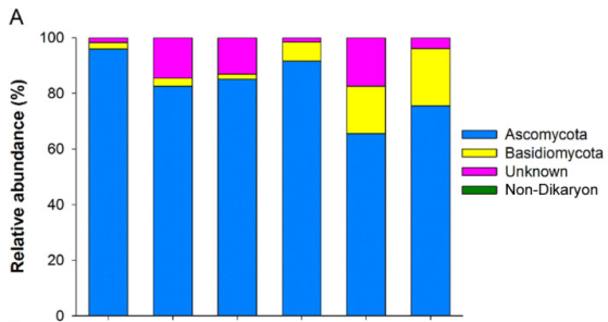 研究者發(fā)現(xiàn)種系豐富度隨著海拔高度逐漸遞增(R2 = 0.1774,P = 0.0069),而均勻度僅僅在高海拔位點(diǎn)增加(R2 =0.6859,P < 0.0001;Fig 1)。香農(nóng)多樣性指數(shù)也隨海拔逐漸增加(R2 = 0.3733,P < 0.0001)。NMDS圖顯示內(nèi)生真菌群落隨海拔高度在逐漸變化(Fig.2A)。ANOSIM分析結(jié)果顯示不同海拔高度的內(nèi)生真菌群落有著顯著性差異(Table S3)。特別的,隨著海拔梯度升高,擔(dān)子菌門相對(duì)豐度顯著升高(Fig.3A)。