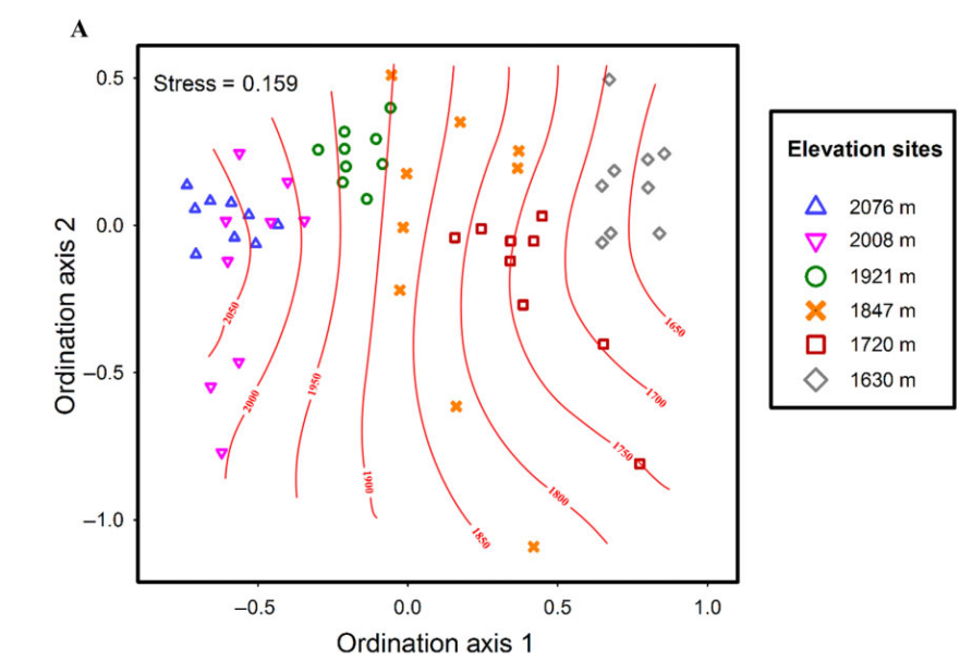 Fig. 2. 基于計(jì)算54個(gè)樹樣本×OTU矩陣得到的NMDS圖。每一個(gè)點(diǎn)(n = 54)表示單個(gè)樹樣本的內(nèi)生真菌群落。海拔梯度被制成光滑的表面,以適應(yīng)NMDS排序。