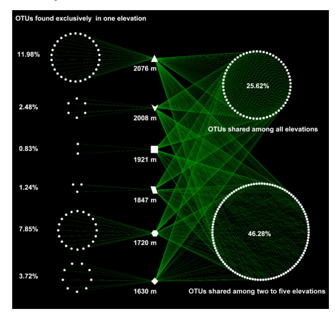 Fig. 4. OTU網(wǎng)絡(luò)圖顯示屬水平上來自不同海拔的所有樣品OUT之間的相互作用。每一個(gè)點(diǎn)代表一個(gè)真菌屬(共有242屬)。在左欄中的屬對(duì)于一個(gè)海拔地點(diǎn)是唯一的,而右欄中的屬隸屬于多個(gè)海拔地點(diǎn)。