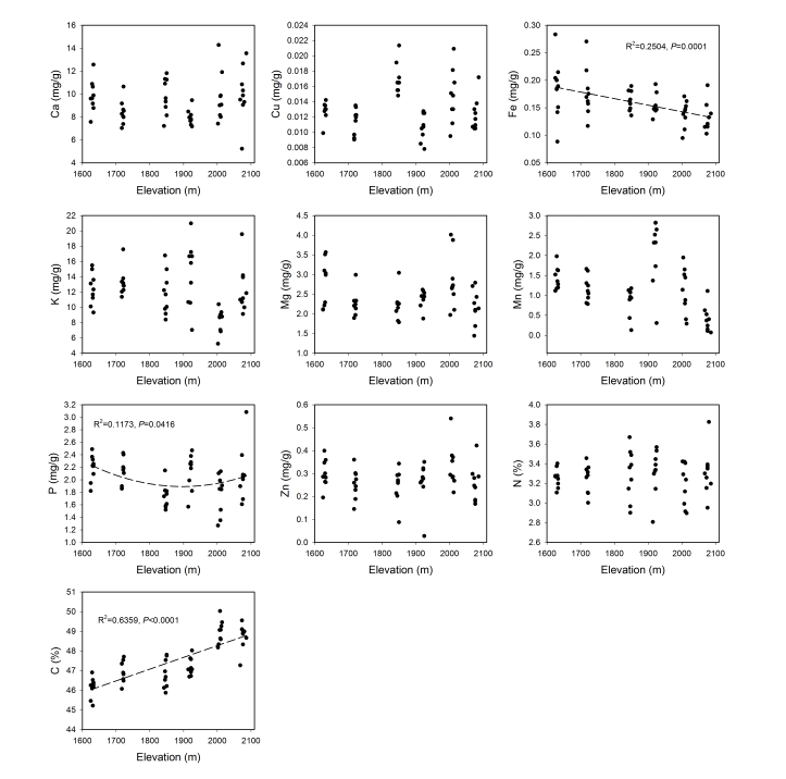Fig. S3葉中的10個(gè)基本元素和海拔高度之間的關(guān)系