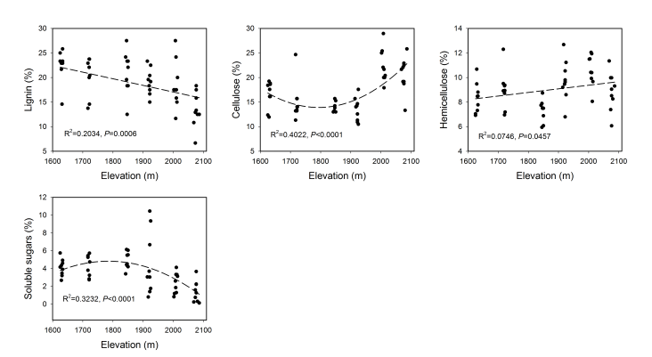 幾乎所測(cè)量植物的一半,包括樹木特征,葉片中基本化學(xué)元素成分和葉片碳組分在不同海拔梯度采樣點(diǎn)顯著變化,其中一些表現(xiàn)出明顯的劃分趨勢(shì)。岳樺樹樹高,直徑,樹蔭長(zhǎng)度和寬度和相鄰樹木密度隨海拔顯示出一個(gè)單峰趨勢(shì)(Fig S3)。10個(gè)基礎(chǔ)元素中,只有C,和Fe含量隨海拔高度變化有顯著性變化。此外,沿海拔梯度變化的四個(gè)碳組分含量有顯著性差異(Fig S4) 。木質(zhì)素含量隨海拔高度增加顯著降低,而半纖維素隨海拔升高緩慢增加,纖維素在高海拔位點(diǎn)含量顯著增加,而可溶性糖類表示出相反趨勢(shì)。