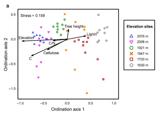 Fig. 2B. 基于計(jì)算54個(gè)樹樣本×OTU矩陣得到的NMDS圖。通過R中的vegan軟件包中的bioenv功能,篩選出與整個(gè)菌落最相關(guān)的6個(gè)環(huán)境因子