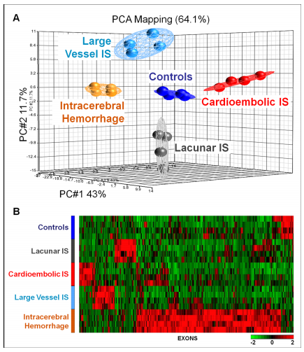 結果: 1、412個基因在五組病人/對照組全血樣品轉錄組中存在不同的剪切本(differential alternative splicing,DAS),這些基因參與了細胞免疫、細胞因子、細胞死亡、存活等信號通路。 2、由于不同剪切本主要是在剪切過程中選擇不同外顯子造成的,進一步分析發(fā)現(xiàn),292個基因的308個外顯子在五組病人/對照組中的表達量存在差異。 3、根據(jù)不同外顯子的表達情況,可將五組病人/對照組劃分開:(如上文結果中圖所示) 心源性腦卒中(Cardioembolic IS)相關剪切本集中在離子結合/轉運和細胞結構通路中; 大血管卒中(large vessel)相關剪切本集中在細胞死亡、轉錄、核染色質重塑通路中; 腔隙性卒中(lacunar)相關剪切本集中在細胞應激、循環(huán)、死亡、生存通路中; 腦溢血(ICH)病人相關剪切本集中在蛋白轉運和定位通路中。