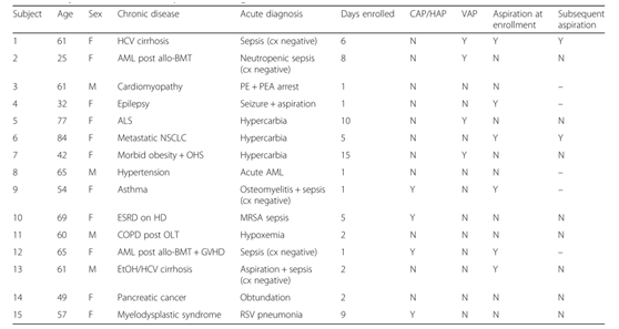 注:年齡,性別,潛在疾病,和機械通氣的急性適應癥對15個受試者進行了記錄。Sepsis(cx negative):無病原體膿毒癥;CAP/HAP:插管后的第一個48小時內診斷為下呼吸道感染(LRTI)則歸類為CAP/HAP;VAP:插管后的第一個48小時后診斷為下呼吸道感染(LRTI)則歸類為VAP;Aspiration:抽吸;Subsequent;Aspiration:反復抽吸。 HCV:乙型病毒性肝炎;AML:急性髓細胞性白血??;BMT:骨髓移植;PE:肺栓塞; PEA: 無脈性電活動; ALS:肌萎縮側索硬化癥;NSCLC:非小細胞肺癌;OHS:肥胖通氣不足綜合征; ESRD:晚期腎?。?/span>HD:血液透析;COPD:慢性阻塞性肺疾?。?/span>OLT:肺移植術, GVHD:移植物抗宿主?。?/span>EtOH:酒精;RSV:呼吸道合胞病毒反復抽吸。