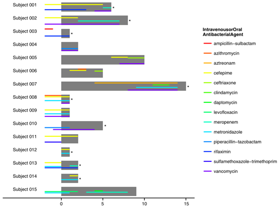 圖4: 隨著時間某些氣管插管者的細菌群落多樣性指數變化。Healthy Control:健康對照組;Mechanical Ventilation Day 0:插管24小時內;Mechanical Ventilation Beyond Day 0:插管超過24小時; 抗生素暴露不能完全解釋插管與呼吸道群落多樣性降低之間的關系 抗生素素暴露會混淆或修改呼吸道α多樣性和插管之間的關系,本文調查了抗生素暴露的效應。我們把圖1的抗生素暴露引入到上面的GEE模型中,結果發(fā)現引入或者不引入單個抗生素或抗生素組合沒有太大影響,這說明插管與呼吸道群落多樣性降低之間的關系并不能單純歸因于插管以后大劑量的抗生素暴露。 下呼吸道群落多樣性降低與下呼吸道感染(LRTI)臨床診斷相關 我們觀察到插管48小時幾例個體(個體5, 8, 10, 12, 15)的群落多樣性極低,因此試圖探討這種模式與呼吸道感染臨床診斷的相關性。結果在插管患者中,我們發(fā)現肺炎的臨床診斷與下呼吸道的群落多樣性進一步降低相關。 臨床培養(yǎng)得到的病原體與16S rRNA測序得到的結果一致 受試者下呼吸道細菌培養(yǎng)鑒定到的病原菌與16S rRNA測序得到的豐度最高OTUs是一致的,但是16S rRNA測序得到的部分優(yōu)勢菌通過傳統(tǒng)培養(yǎng)卻沒有得到,例如細小支原體和糞腸球菌。 總結: