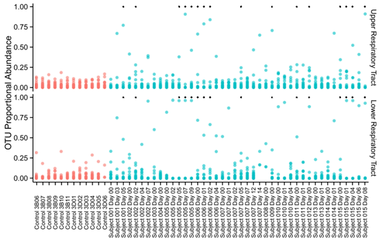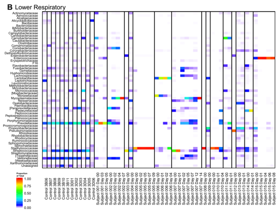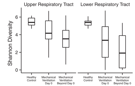 • 與健康對照組上呼吸道和下呼吸道菌群高多樣性相比,氣管插管組在兩個部位都有較低的菌群多樣性。