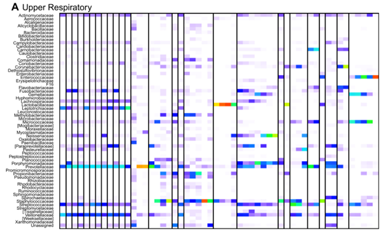圖2: 插管組和健康對照組的上(A)、下(B)呼吸道科水平的細菌群落熱圖。 插管者的呼吸道菌群由一個單一OTU占據 每個呼吸道樣本的菌落結構比例,結果發(fā)現相比健康對照組,在插管組(上呼吸道和下呼吸道)具有最大豐度比例的OUT占據主要部分,并且Shannon 指數表明相比健康對照組,插管組的微生物多樣性更低。