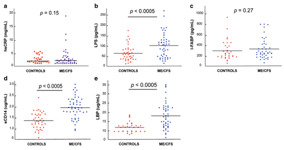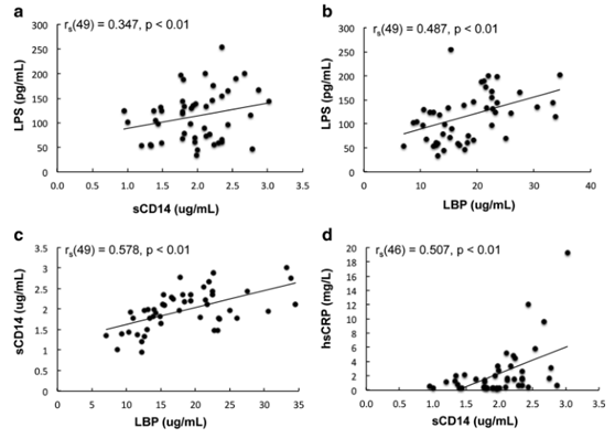 圖1. 健康對照組和ME/CFS患者微生物易位標志物,胃腸道損壞標志物的表達水平:hsCRP (a), LPS (b), I-FABP (c), sCD14 (d), and LBP (e) 接下來分析了這些生物標志物之間的關(guān)聯(lián),從圖2a, b可以看出LPS的水平與sCD14,LBP正相關(guān)。另外發(fā)現(xiàn)sCD14和LBP(圖2c),sCD14和hsCRP(圖2d)也存在較強的相關(guān)性。另外也分析了胃腸道損害標志物I-FABP水平與I-FAB微生物易位標記物(LPS、sCD14、LBP)水平是否相關(guān),結(jié)果發(fā)現(xiàn)它們之間沒有相關(guān)性。