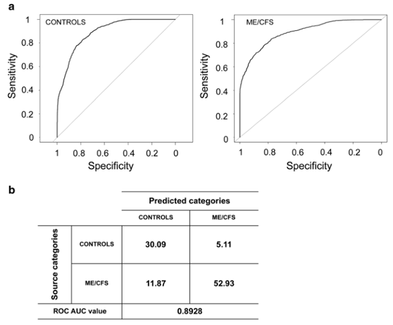 圖5: ME / CFS患者和健康對照組屬水平的LEfSe分析。LDA的分數(shù)表示每一個差異豐富的物種的影響大小和排名 使用炎癥標志物和微生物組數(shù)據(jù)可將受試者分為ME / CFS患者和健康對照組 使用通過16S rRNA數(shù)據(jù)和炎癥標志物數(shù)據(jù)得到的模型,ME/CFS患者和健康組可成功區(qū)分開, 例如使用區(qū)分到屬水平上OTUs,個體鑒別為ME/CFS患者的正確率達到82.93%。另外使用通過16S rRNA數(shù)據(jù)和炎癥標志物數(shù)據(jù)得到的數(shù)學(xué)模型鑒定ME/CFS患者的ROC曲線AUC值為0.89(圖6),說明使用炎癥標志物和微生物組數(shù)據(jù)得到的數(shù)據(jù)模型可有效地鑒定ME / CFS患者和健康對照組。
