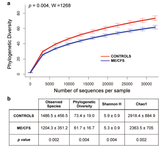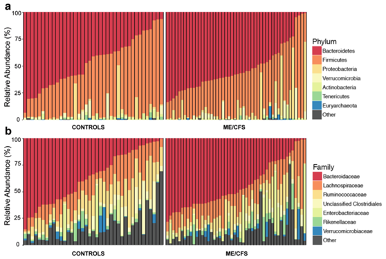 圖3: ME / CFS患者和健康對照組的腸道菌群alpha多樣性分析。 ME / CFS患者和健康對照組的腸道菌群組成在門水平和科水平上有明顯差異(圖4a, b)。ME / CFS患者和健康對照組豐度比例最高的是厚壁菌門,擬桿菌門和變形菌門(圖4a, b)。在健康對照組,厚壁菌門的豐度比例是46%,而在ME / CFS患者中,厚壁菌門的豐度比例降到35 %,這可能是由于厚壁菌門中的瘤胃菌科和類桿菌科的豐度比例顯著下降造成的(圖4 b)。但是變形菌門在ME / CFS患者中的豐度比例相對于健康對照組有所上升(圖4 a),這可能是由于變形菌門中的腸桿菌科豐度比例顯著上升造成的(圖4 b)。