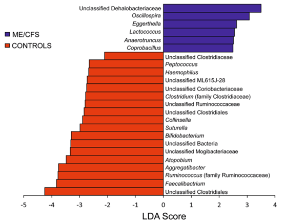圖4: ME / CFS患者和健康對照組的腸道菌群組成分析。a,門水平;b,科水平 經(jīng)過多重檢驗校正,在OTUs水平,厚壁菌門的大多數(shù)成員,例如顫螺菌屬(q = 0.016)、普拉梭菌屬(q = 0.014)、 瘤胃球菌屬(q = 0.014)、糞球菌屬(q = 0.014)在Case/Control組間存在顯著差異。 通過LEfSe分析找到了對Case/Control組間樣本劃分產(chǎn)生顯著性差異影響的24個物種(屬水平,LDA得分>2)(圖5)。ME / CFS患者微生物主要集中在未分類的Desulfohalobacteriaceae和厚壁菌門下的顫螺菌屬、乳球菌屬等五個菌屬,而健康對照組主要富集在雙歧桿菌科等18個菌屬中。