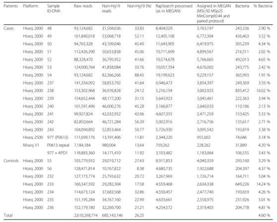 英文題目:In silico analyses of metagenomes from human atherosclerotic plaque samples 中文題目:人動(dòng)脈粥樣硬化斑塊樣本的宏基因組學(xué)分析 期刊名:Microbiome 發(fā)表時(shí)間:2015 IF:9 技術(shù):宏基因組測序 測序平臺(tái):Illumina HiSeq2000測序平臺(tái)(PE100) 材料:(1)有癥狀的不穩(wěn)定動(dòng)脈粥樣硬化斑塊(case):是從15例由于近期經(jīng)受短暫腦缺血或輕微中風(fēng)患者的頸動(dòng)脈內(nèi)膜切除術(shù)中獲得的。(2)無癥狀的穩(wěn)定動(dòng)脈粥樣硬化斑塊(control):是從7個(gè)患者的尸檢中獲得,這組患者的死因與心血管疾病無關(guān)。取3–5毫米厚的組織,立即儲(chǔ)存于−80 °C。 研究背景: 動(dòng)脈粥樣硬化(atherosclerosis,AS)是一組動(dòng)脈硬化的血管病中常見的最重要的一種,其特點(diǎn)是受累動(dòng)脈病變從內(nèi)膜開始。一般先有脂質(zhì)和復(fù)合糖類積聚、出血及血栓形成,纖維組織增生及鈣質(zhì)沉著,并有動(dòng)脈中層的逐漸蛻變和鈣化,病變常累及彈性及大中等肌性動(dòng)脈,一旦發(fā)展到足以阻塞動(dòng)脈腔,則該動(dòng)脈所供應(yīng)的組織或器官將缺血或壞死。由于在動(dòng)脈內(nèi)膜積聚的脂質(zhì)外觀呈黃色粥樣,因此稱為動(dòng)脈粥樣硬化。不穩(wěn)定動(dòng)脈粥樣硬化斑塊是導(dǎo)致斑塊破裂、潰瘍致使動(dòng)脈內(nèi)血栓形成從而引起卒中的主要發(fā)病機(jī)制,具有極大的危害性。 通過觀察和機(jī)理研究發(fā)現(xiàn)微生物感染能引起心血管疾病,血管壁的直接感染在動(dòng)脈粥樣硬化形成過程中發(fā)揮著關(guān)鍵作用,例如能夠促進(jìn)引起內(nèi)皮功能障礙的炎癥反應(yīng)發(fā)生,并產(chǎn)生導(dǎo)致動(dòng)脈粥樣硬化和血栓形成的環(huán)境,最終導(dǎo)致心血管疾病,如急性心肌梗死或中風(fēng)?,F(xiàn)在已經(jīng)有一些從動(dòng)脈粥樣硬化血管中分離出活性微生物的相關(guān)研究,然而目前關(guān)于動(dòng)脈粥樣硬化血管的微生物感染的高通量調(diào)查研究是非常有限的。 研究結(jié)果: 測序和數(shù)據(jù)處理 所有22個(gè)動(dòng)脈斑塊樣品共產(chǎn)生2610268774條reads,然后把這些序列和人類Hg19基因組比對,沒有比對上Hg19基因組的reads平均數(shù)是884727044(每個(gè)樣本平均有33.89%,表1)。將這些non-hg19 reads與NCBI非冗余蛋白數(shù)據(jù)庫比對,然后將PE reads輸入到MEGAN5軟件。