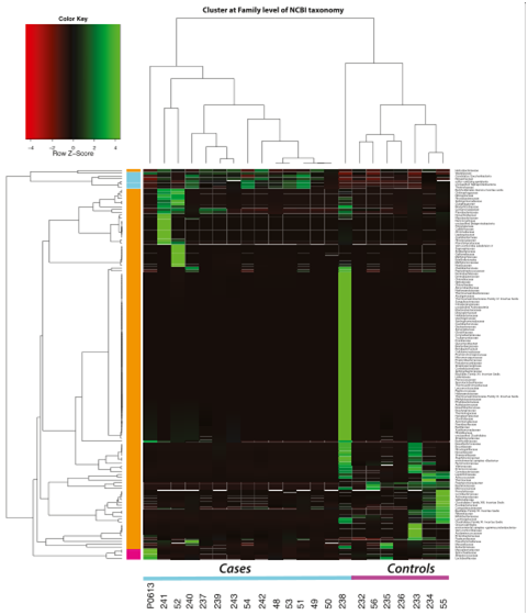 表1:樣本統(tǒng)計(jì)和序列比對 分類學(xué)注釋 所有non-hg19注釋reads有2%-16%(平均4.6%)被分類為細(xì)菌,其余的是真核生物。表1展示了測序序列統(tǒng)計(jì)和不同階段數(shù)據(jù)處理后的序列分配結(jié)果。圖1描述了所有22個(gè)樣品屬水平的層次聚類結(jié)果。有趣的是,樣品238和p0613是和其它樣品最不同的,所有不穩(wěn)定斑塊樣品(case組)聚集到一起,而所有穩(wěn)定斑塊樣品(control組)也聚集到一起。相比于不穩(wěn)定動(dòng)脈粥樣硬化斑塊,穩(wěn)定硬化斑塊有更高的宿主微生物豐度,例如紫單胞菌科、鏈球菌科、擬桿菌科、微球菌科(圖1)。相反的是,相對于穩(wěn)定斑塊樣品,不穩(wěn)定斑塊樣品有更多病原微生物,如螺旋桿菌科、奈瑟氏球菌科、硫消費(fèi)家族如硫氧化共生體和硫發(fā)菌科(圖1)。