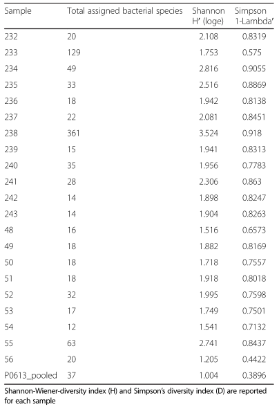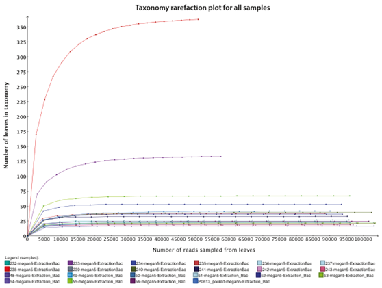 圖1:來自15例有癥狀動(dòng)脈粥樣硬化性患者(實(shí)驗(yàn)組)的不穩(wěn)定動(dòng)脈粥樣硬化斑塊和7例死于其它原因患者(對照組)的穩(wěn)定斑塊的分層聚類結(jié)果。 從序列統(tǒng)計(jì)(表1),多樣性指數(shù)分析(表2),稀釋性曲線(圖2)明顯可以看出22個(gè)樣本中有2個(gè)樣本(樣本233和238)比其它樣本有更多的物種數(shù)。
