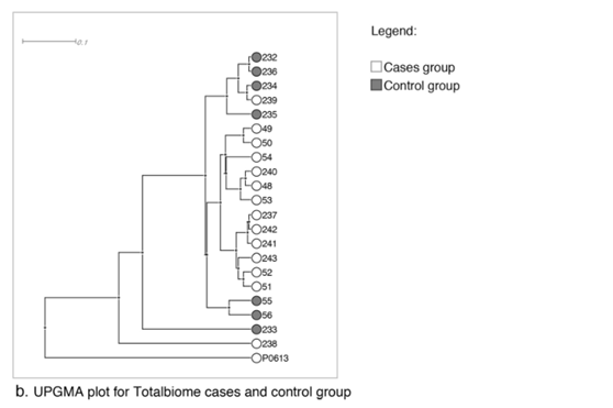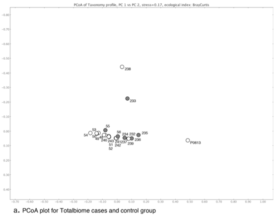圖3:22個(gè)樣品(不穩(wěn)定斑塊樣品和不穩(wěn)定斑塊樣品)的PCoA分析圖和UPGMA樹。不穩(wěn)定的動(dòng)脈粥樣硬化斑塊樣品用白色圓圈表示,7個(gè)穩(wěn)定斑塊樣品(對照組)用灰色圓圈表示。