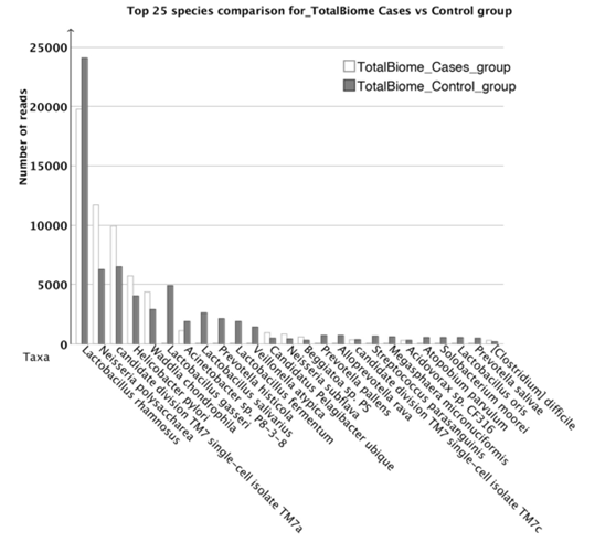 圖4:所有樣品(不穩(wěn)定斑塊樣品和不穩(wěn)定斑塊樣品)科水平下的分類學(xué)系統(tǒng)組成樹。不穩(wěn)定的動(dòng)脈粥樣硬化斑塊樣品用白色表示,7個(gè)穩(wěn)定斑塊樣品(對照組)用灰色表示。一些可能是人類起源的物種被標(biāo)記為黑色的十字架。 圖5展示了所有樣本中豐度最高的25個(gè)菌種,不穩(wěn)定斑塊樣品(case組)中豐度最高的是鼠李糖乳桿菌MTCC 5462,多糖奈瑟球菌ATCC 43768,幽門螺旋桿菌Hp P-4,食酸菌屬CF316,并且這些菌的豐度在不穩(wěn)定斑塊樣品和不穩(wěn)定斑塊樣品中存在差異,提示這些菌可能參與促進(jìn)無癥狀動(dòng)脈粥樣硬化斑塊向有癥狀動(dòng)脈粥樣硬化斑塊的轉(zhuǎn)變。