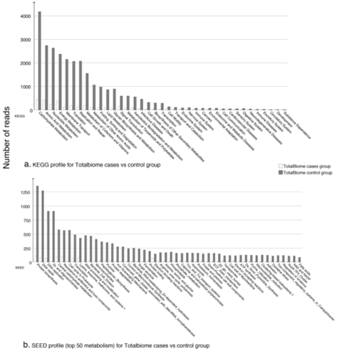 圖5:所有樣本中豐度最高的25個(gè)菌種,不穩(wěn)定的動(dòng)脈粥樣硬化斑塊樣品用白色表示,穩(wěn)定斑塊樣品(對照組)用灰色表示。 功能分析和總生物群落的比較 使用SEED和KEGG分類對總生物群落進(jìn)行功能分析,結(jié)果發(fā)現(xiàn)在基礎(chǔ)代謝和疾病通路方面不穩(wěn)定斑塊樣品和不穩(wěn)定斑塊樣品之間存在明顯差異(圖6),并且都參與“碳水化合物”、“氨基酸”和“能量”等有關(guān)代謝。另外也與“心血管疾病“、“循環(huán)系統(tǒng)”、“免疫系統(tǒng)”、“細(xì)胞生長與死亡”與“傳染病”等疾病相關(guān)通路。