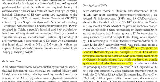 2011年,天昊生物推出了自主專(zhuān)利的高通量SNP分型技術(shù)——SNPscanTM,該技術(shù)基于連接反應(yīng)及熒光PCR原理設(shè)計(jì),已有48-plex、96-plex、192-plex等多種通量。因其不僅具有高準(zhǔn)確性、高通量、高效率等特性,同時(shí),成本也明顯低于其他中高通量SNP分型技術(shù)的特點(diǎn)而廣受客戶(hù)青睞。上海天昊與復(fù)旦大學(xué)合作利用SNPscanTM技術(shù)對(duì)粥樣硬化性心血管疾病進(jìn)行關(guān)聯(lián)研究,2012年8月,文章發(fā)表在美國(guó)著名心血管相關(guān)雜志Journal of Thrombosis and Hemostasis上,天昊生物作為作者之一(劉燕博士,天昊生物技術(shù)部經(jīng)理)共享了這一研究成果。 ![]() ![]() 此項(xiàng)研究通過(guò)對(duì)92個(gè)位點(diǎn)的分型,比較了天昊生物專(zhuān)利技術(shù)的SNPscan TM 和Life Technologies的SNaPshot 技術(shù),結(jié)果一致性高于99%,證明了天昊生物SNPscan TM技術(shù)是一項(xiàng)準(zhǔn)確性高、穩(wěn)定性強(qiáng)、成熟可靠的高通量SNP分型技術(shù)。希望廣大新老客戶(hù)可以利用這一新技術(shù)開(kāi)展自己的科研工作,爭(zhēng)取用更節(jié)約的成本,發(fā)表更高水平的文章! |