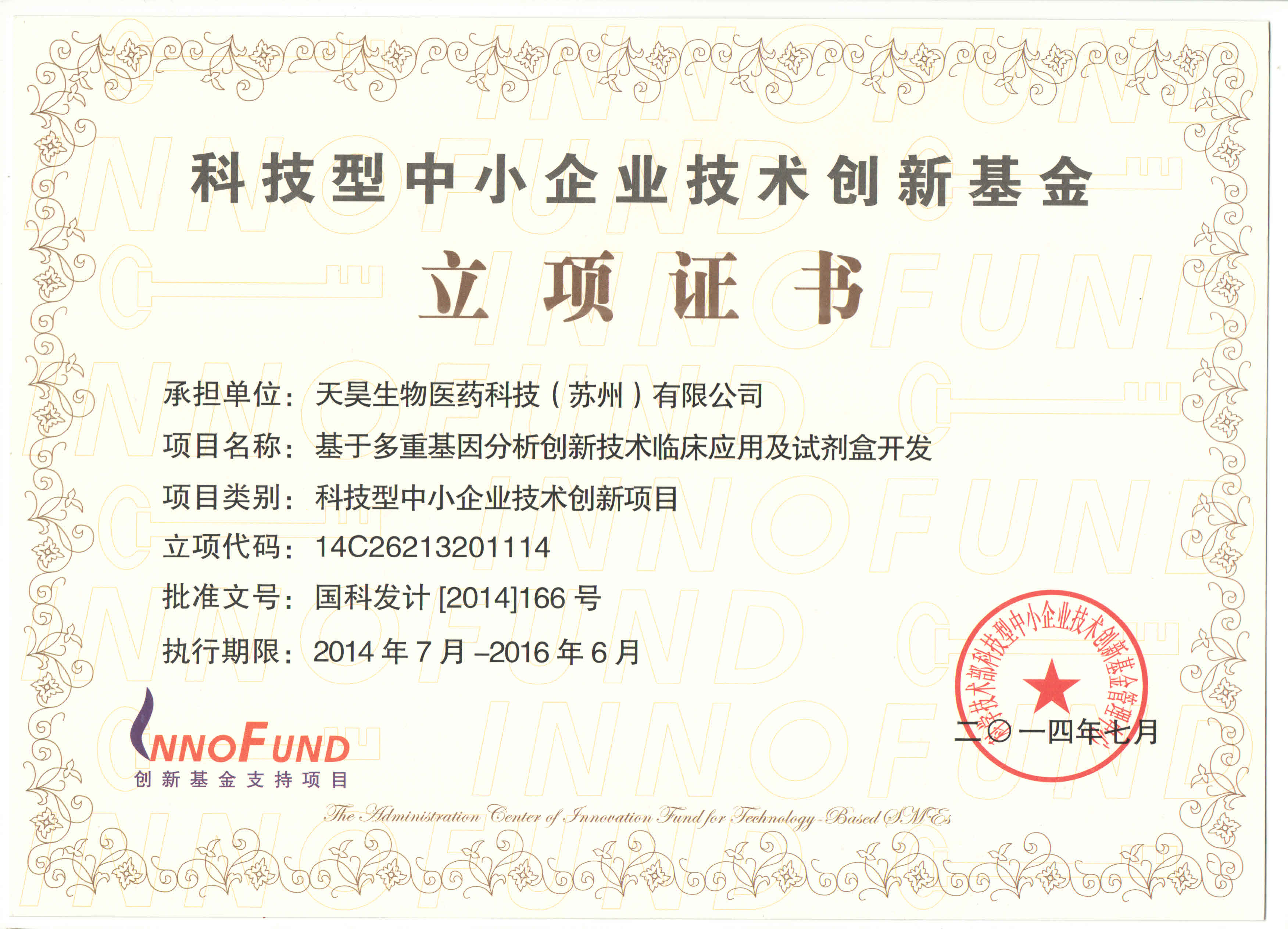 熱烈祝賀天昊生物醫(yī)藥科技(蘇州)有限公司于2014年7月獲得科技型中小企業(yè)技術(shù)創(chuàng)新項目,該項目由科技部頒發(fā),項目內(nèi)容是為期兩年的基于多重基因分析創(chuàng)新技術(shù)臨床應(yīng)用及試劑盒開發(fā)。該項目的獲得是國家創(chuàng)新基金對天昊生物工作的肯定,我們一定會利用好現(xiàn)有的資源,在國家創(chuàng)新基金的指導下,順利完成創(chuàng)新項目。