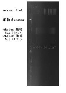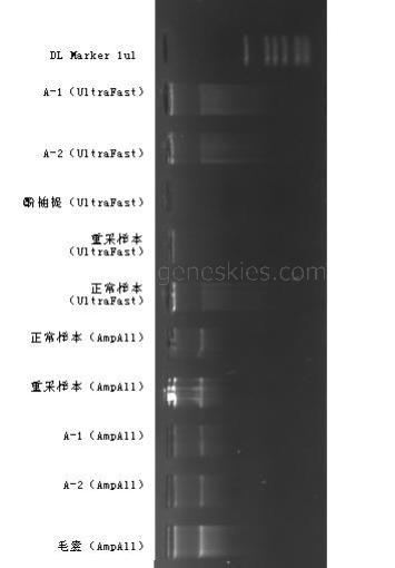 DNA抽提結(jié)果: (1)REPLI-g UltraFast Mini Kit(25),實(shí)驗(yàn)后按說明書1:25稀釋。 (2)AmpAll® 全基因組擴(kuò)增試劑盒——DNA,實(shí)驗(yàn)后按說明書原位5被稀釋,做后續(xù)實(shí)驗(yàn)再進(jìn)行10被稀釋。 (考慮到A-2和重采樣本原液濃度比較低,做擴(kuò)增的時(shí)候加了5ul模板,A-1和正常樣本取1ul模板。) (3)AmpAll® 全基因組擴(kuò)增試劑盒——毛囊,實(shí)驗(yàn)后按說明書原位3被稀釋,做后續(xù)實(shí)驗(yàn)再進(jìn)行10被稀釋。(兩個(gè)毛囊) 取上述實(shí)驗(yàn)結(jié)果5ul跑電泳,DL2000 marker是1ul。