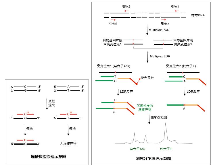 連接酶檢測(cè)反應(yīng) (ligase detection reaction,LDR)是利用高溫連接酶實(shí)現(xiàn)對(duì)基因多態(tài)性位點(diǎn)的識(shí)別。高溫連接酶一旦檢測(cè)到DNA與互補(bǔ)的兩條寡聚核苷酸接頭對(duì)應(yīng)處存在著基因點(diǎn)突變類型的堿基錯(cuò)配,則連接反應(yīng)就不能進(jìn)行。 如下左圖:右邊的探針與模板有一個(gè)堿基不配對(duì),所以連接反應(yīng)不能進(jìn)行,沒(méi)有連接產(chǎn)物;左邊的探針與模板DNA完全互補(bǔ),故進(jìn)行連接反應(yīng)。通過(guò)溫控循環(huán)該特異性連接反應(yīng)可反復(fù)進(jìn)行,達(dá)到線性擴(kuò)增的效果。當(dāng)檢測(cè)到DNA與互補(bǔ)的兩條寡聚核昔酸接頭對(duì)應(yīng)處存在著堿基錯(cuò)配,則連接反應(yīng)就不能進(jìn)行。在同時(shí)存在著熒光標(biāo)記的探針時(shí),由于前者與模板DNA互補(bǔ),故它與下游探針的連接反應(yīng)得以進(jìn)行,而后者則無(wú)法與下游探針連接。在連接反應(yīng)結(jié)束后進(jìn)行測(cè)序儀檢測(cè),檢測(cè)到的結(jié)果即為G,從而可認(rèn)定該SNP位點(diǎn)為G。LDR檢測(cè)方法利用長(zhǎng)度差異可以將多重LDR產(chǎn)物在ABI測(cè)序系統(tǒng)中進(jìn)行檢測(cè),實(shí)現(xiàn)一次檢測(cè)多個(gè)SNP位點(diǎn)。 ![]() 應(yīng)用領(lǐng)域: 本方法適用于多個(gè)涉及到SNP分型的遺傳研究領(lǐng)域。