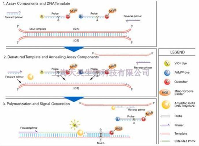 此技術是由美國Life technologies公司研發(fā)的SNP分型技術,其技術原理如下簡介。PCR 反應時,加入一對兩端有不同熒光標記的特異探針來識別不同的等位基因(allele1和allele2),5’端為報告熒光基團(reporter),3’端為淬滅熒光基團 (quencher)。PCR過程中,兩個探針能與正向引物和反向引物之間的互補序列特異退火結合。當探針以完整形式存在時,由于能量共振轉移,熒光基團只發(fā)出微弱熒光。特異的探針與相應的等位基因雜合后,DNA聚合酶發(fā)揮5’到3’外切酶活性,把報告熒光基團切割下來,脫離了3’端淬滅熒光基團的淬滅作用 (quench),從而發(fā)出熒光。兩個探針的5’端標有不同的熒光 (FAM或VIC),3’端標有MGB 淬滅基團結合體。根據(jù)檢測到的不同熒光,可以判斷相應的樣本的SNP 等位基因型。 整個技術的示意圖如下: 應用領域: 本方法適用于多個涉及到SNP分型的遺傳研究領域。尤其適合針對全基因組SNP關聯(lián)研究獲得的初步陽性位點,以及全基因組測序得到的大量初篩突變位點進行進一步的大樣品驗證研究。