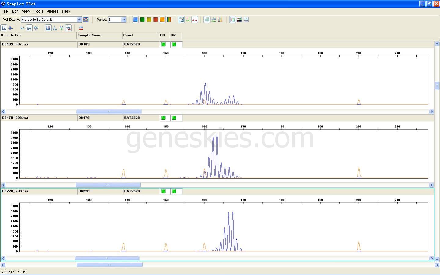 BAT25位點(diǎn)截圖(上面2個(gè)樣本明顯存在微衛(wèi)星不穩(wěn)定現(xiàn)象,最下面是正常樣本): |