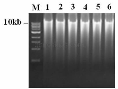 圖二, 不同樣品的全基因組擴(kuò)增情況。M 是標(biāo)準(zhǔn)分子量DNA,1是0.1ng DNA,2是1ng DNA, 3是10ng DNA,4是一根發(fā)根,5是口腔粘膜刮液,6是0.2 µl 新鮮血樣。 |